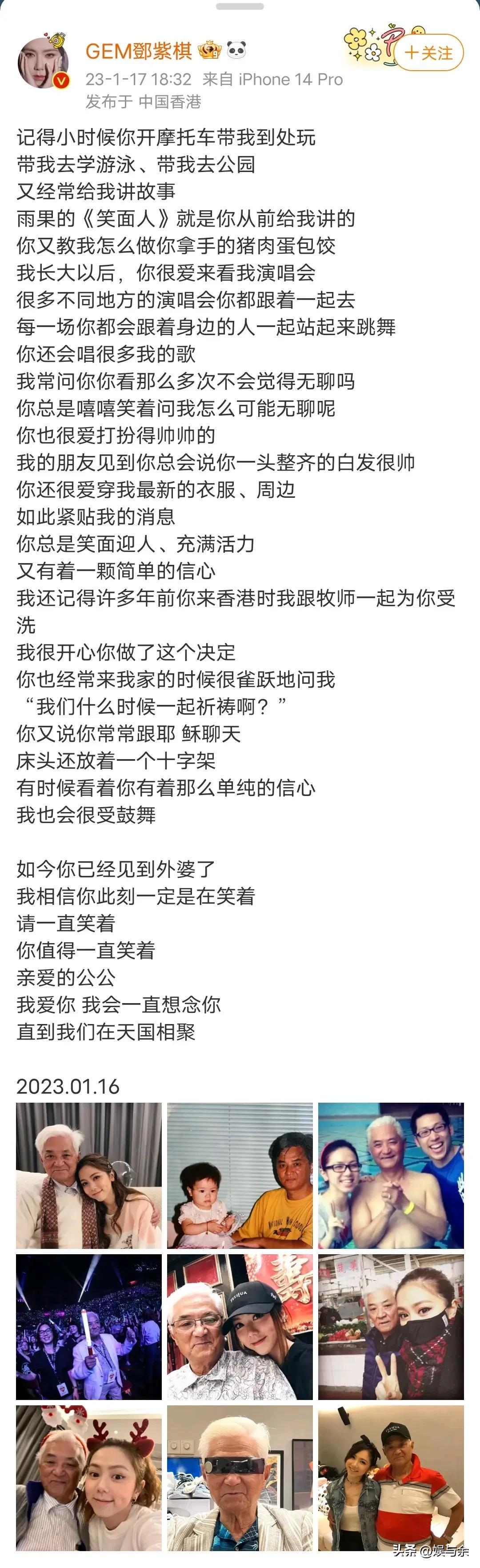 17日晚,邓紫棋更新了社交平台动态,这次没有带来新作品,而是带来一个噩耗,自己的外公已经在16日离开人间,远赴天国!